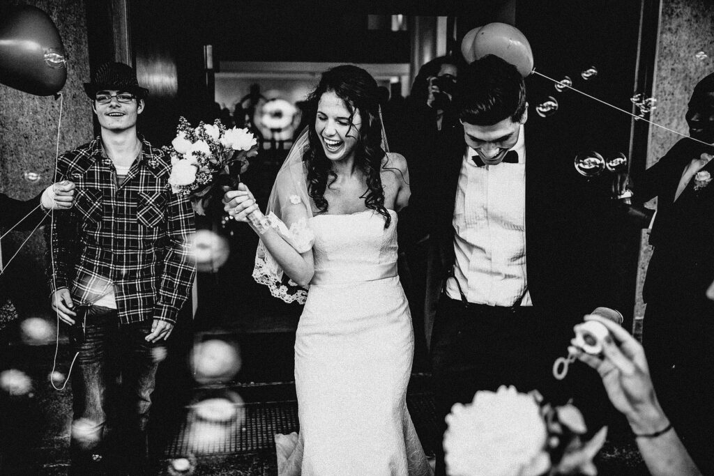 • Der Auszug: Wünscht ihr euch einen „bombastischen“ Auszug? Bittet eure Trauzeugen, dass die Gäste bereitstehen und euch mit Seifenblasen oder Blumen empfangen.